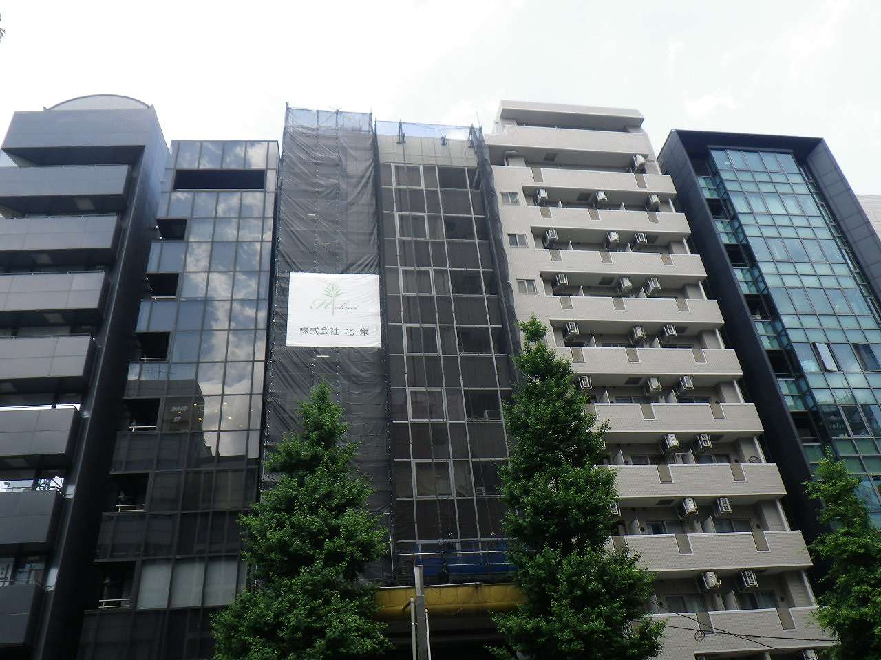 あとに行う塗装や防水工事に先立ち、外壁や床、天井を高圧洗浄機を用いて洗う。 汚れの激しいタイル面は薬品により、洗浄の促進を行う。